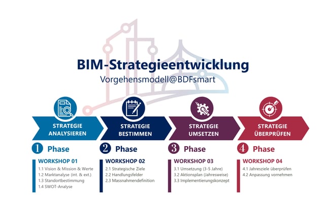 Die BDFsmart hat ein durchgehendes Konzept für die Erarbeitung einer individuellen BIM-Strategie entwickelt. Es liefert ein praxisgerechtes Vorgehensmodell und stellt die erfolgreiche BIM-Einführung in Ihrem Unternehmen sicher.